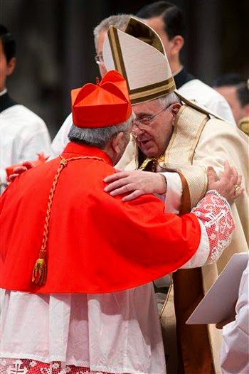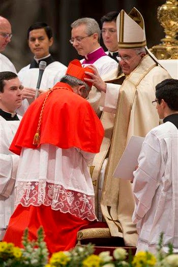Kế đến, từng Hồng Y lần lượt tiến lên quì trước mặt ĐTC để ngài đội mũ đỏ Hồng Y, với lời nhắn nhủ: