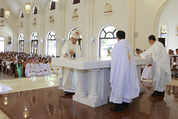 - Đặt hài cốt các Thánh Tử đạo vào bàn thờ: Linh mục Tuyên úy đan viện Giuse Đỗ Quang Khang đã kính cẩn rước di cốt của Thánh linh mục Anrê Trần An Dũng Lạc, Thánh giám mục Thừa sai Paris Phêrô Borie Cao, Thánh nữ Annê Lê Thị Thành và Thánh Tôma Trần Văn Thiện. Trân trọng đón nhận, ĐGM chủ tế đã đặt các Xương Thánh vào bàn thờ đá mới.