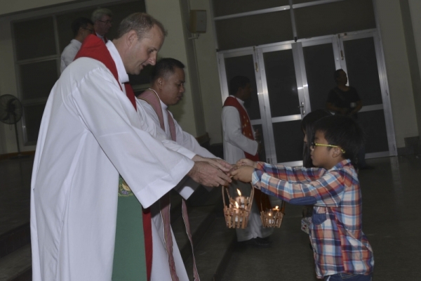 Khởi đầu phần Phụng vụ Thánh Thể, từ các hàng ghế của mình, các em hân hoan tiến ra, mang lễ vật dâng lên Chúa. Các trẻ bé nhỏ hơn cũng được phụ huynh nắm tay dắt đi lên. Trong Thánh lễ dành cho người nước ngoài hằng tuần tại Trung tâm Mục vụ TGP.TPHCM, giây phút dâng lễ vật như thế này là lúc các trẻ bé thích nhất!