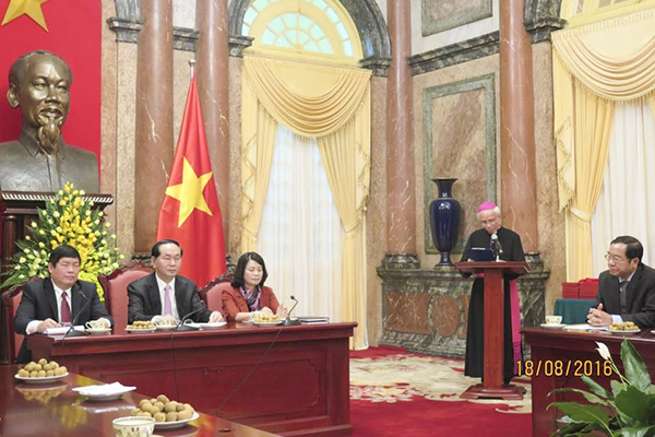 Tại buổi lễ chúc mừng, Đức cha Tổng thư ký đã có bài phát biểu chúc mừng ông Chủ tịch nước, đồng thời nói lên nguyện vọng của Giáo hội Công giáo tại Việt Nam luôn chia sẻ những vui mừng và lo âu của dân tộc. Trong dịp này, Đức cha cũng đề nghị ông Chủ tịch nước quan tâm tới mối quan hệ bang giao giữa Toà thánh và Nhà nước Việt Nam, việc Đức Giáo hoàng có thể tới thăm Việt Nam, việc Giáo hội Công giáo tham gia vào các công tác giáo dục, từ thiện nhân đạo và môi trường.