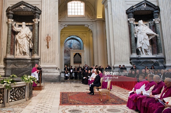 Đến Đền thờ, Tổng thống được ĐHY tân cử Angelo De Donatis cùng với tất cả các kinh sĩ đón tiếp. Sau lời chào mừng của ĐHY, sau một lời nguyện, có bài đọc Kinh Thánh, rồi tổng thống vào Nhà nguyện Colonna và ký văn kiện nhận chỗ của mình trong cung nguyện của kinh sĩ đoàn. Trong dịp này, tổng thống được các kinh sĩ trao tặng một bản sao Thánh Giá Laterano. Tiếp đến Tổng Thống vào khuôn viên của Vương cung thánh đường và được giới thiệu pho tượng vua Henri 4 bằng đồng là đệ nhất kinh sĩ đầu tiên của Đền thờ này. Sau cùng, tổng thống viếng thăm lầu một của dinh Tông Tòa ở Laterano nơi cư ngụ của các vị Giáo Hoàng, cùng với phòng Hòa Giải và Phòng của các Hoàng Đế.