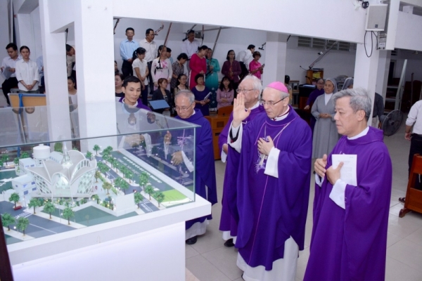 Sau khi ban phép lành cuối lễ, Đức TGM Leopoldo Girelli đã làm phép mô hình tổng quan ngôi thánh đường tương lai của giáo xứ.
