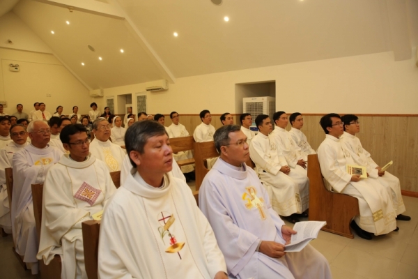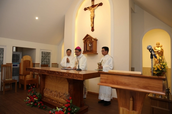 Nhà Nguyện ở lầu 3. Tại đây, Đức Giám quản đã làm phép nước và dùng nước ấy rảy chung quanh nhà nguyện và nhà mục vụ. Sau khi công bố Tin Mừng, Đức Giám quản đã chia sẻ ngắn gọn ý của Đức cố TGM Phaolô Bùi Văn Đọc: chương trình đào tạo các linh mục sẽ thêm 2 bước: Bước phó tế: tất cả sẽ tập trung tại đây và được huấn luyện riêng. Bước 5 năm đầu đời linh mục: cũng về đây để được huấn luyện học hỏi thêm.