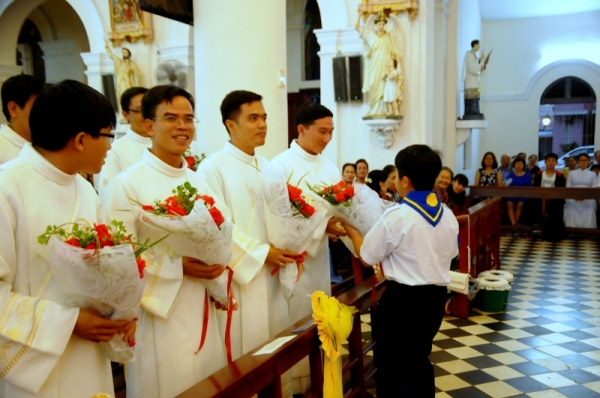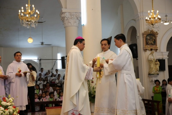 Sau đó, Đức cha Giám quản đã lấy lửa từ nến Phục sinh và trao lại cho 17 thầy phó tế với lời nhắn nhủ: “Anh em hãy nhận ánh sáng Chúa Kitô chiếu soi hành trình phục vụ của anh em và anh em hãy nên ánh sáng cho trần gian, nên muối cho đời, để qua gương sống và tinh thần phục vụ của anh em, mọi người nhận biết Thiên Chúa yêu thương”.
