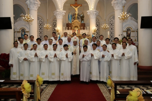 Lễ xong, Đức cha Giám quản Giuse đã chụp hình lưu niệm chung với quý cha đồng tế, quý cha giáo Chủng viện và 17 thầy phó tế. Sau đó, cha chánh xứ Tân Định đã mời mọi người qua phòng tiệc nhà xứ mới để dự buổi tiệc chia sẻ niềm vui.