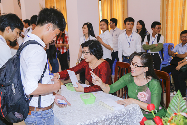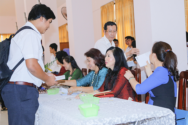 Cuối cùng, giây phút hạnh phúc của các em sinh viên hiếu học, có hoàn cảnh khó khăn đã đến, các em lần lượt nhận học bổng từ tay các daonh nhân Công giáo cùng với lời chúc mừng của các cô chú.