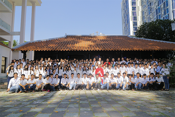 Chụp hình lưu niệm cùng hai Cha, Ban Đại diện Giới DNCG và các em sinh viên.