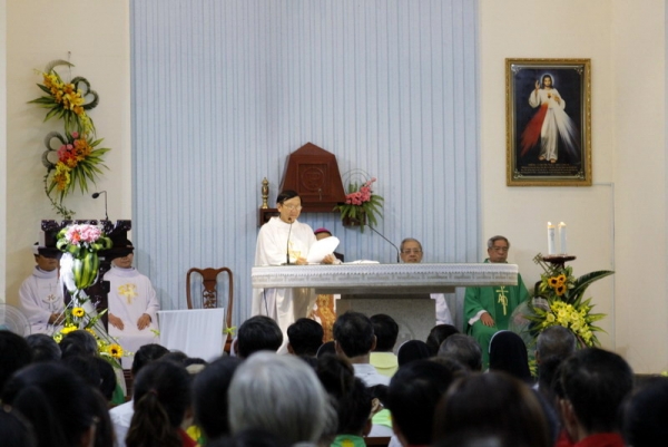 Mở đầu bài giảng, ĐGQ đã nêu lên bước ngoặt quan trọng trong việc chuyển giao giáo điểm An Thới Đông từ các cha DCCT cho TGP. Dưới ánh sáng Lời Chúa từ bài đọc 1, ĐGQ đã giúp cộng đoàn nhận ra Thánh Phêrô cũng đã chăn dắt đoàn chiên Chúa và xây dựng Hội Thánh của Chúa Kitô với một khởi đầu nhiều đầy gian khó. Từ đó, ngài giúp cộng đoàn liên tưởng tới những khó khăn thủa ban đầu nơi miền đất Truyền giáo An Thới Đông này: một vùng đất nghèo, không bóng dáng người Công giáo… Quý cha, quý thầy DCCT đã đến chia sẻ, đồng hành với bà con nghèo nơi đây và là những thừa sai khai phá công cuộc LBTM. Bên cạnh đó, quý nữ tu Dòng Mến Thánh Giá (MTG) Chợ Quán và nhiều thành phần dân Chúa từ thành phố cũng đã cộng tác dấn thân đem Tin Mừng Chúa cho những người dân nghèo nơi đây. Đặc biệt là sự đóng góp của nhiều thành phần dân Chúa trong việc xây dựng ngôi thánh đường khang trang này, nhân dịp mừng thất tuần ĐHY GB Phạm Minh Mẫn, vào năm 2004. ĐGQ mời gọi cộng đoàn hãy tạ ơn Chúa về sự cộng tác của các thành phần dân Chúa, của các dòng tu… đã góp phần xây dựng nên Gx. An Thới Đông ngày hôm nay, nhờ đó gia đình TGP Sài Gòn được phát triển. Rồi ĐGQ dẫn vào bài Tin Mừng và chia sẻ về ý nghĩa của “Bánh hằng sống”. Bà con nghèo nơi đây không chỉ cần cơm bánh hằng ngày nhưng còn cần đến “Bánh hằng sống”. Ngôi nhà thờ An Thới Đông này, chính là nơi qui tụ mọi người đến để gặp gỡ Chúa Giêsu và để được đón nhận sự sống đời đời, qua việc nghe Lời Chúa và lãnh nhận Mình Máu Thánh Chúa… Ngài nhấn mạnh lại câu lời Chúa trong bài Tin Mừng: “Các ngươi hãy ra công làm việc không phải vì của ăn hay hư nát nhưng vì của ăn tồn tại cho đến muôn đời là của ăn Con Người sẽ ban cho các ngươi” (Ga 6,27).