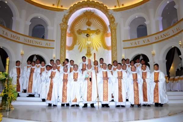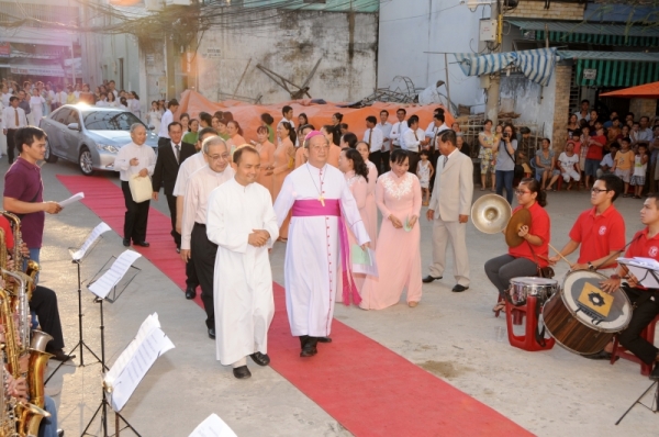 Đồng tế với ngài có cha Tổng Đại diện Ignatiô Hồ Văn Xuân, cha Giuse Đỗ Mạnh Hùng - Chưởng Ấn, cha Giuse Vũ Minh Nghiệp - đại diện linh mục, cha Đaminh Đinh Ngọc Lễ - Hạt trưởng giáo hạt Xóm Mới cùng gần 40 linh mục trong và ngoài giáo hạt Xóm Mới.
