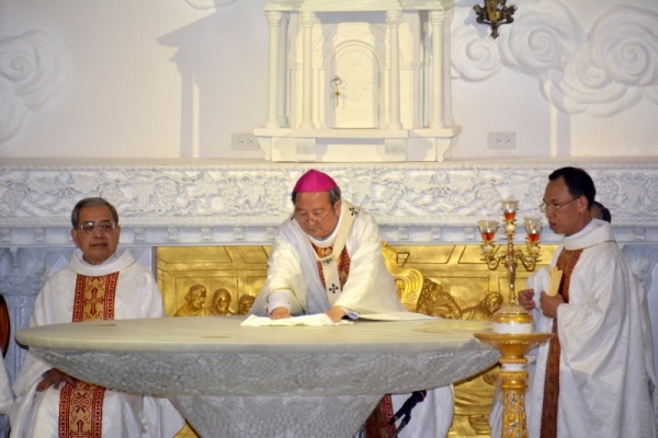 Sau khi cộng đoàn sốt sắng hát kinh cầu các thánh, Đức TGM đã đặt xương Thánh linh mục Giuse Ngô Duy Hiển vào bàn thờ, cử hành nghi thức xức dầu thánh và xông hương bàn thờ mới, thắp sáng các đèn nến cho việc cử hành Thánh Thể để xin Thiên Chúa đoái nhìn của lễ Hội Thánh sẽ dâng trên bàn thờ này, và làm cho Dân Chúa trở nên của lễ muôn đời dâng lên Chúa.