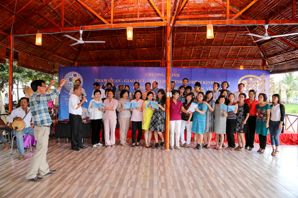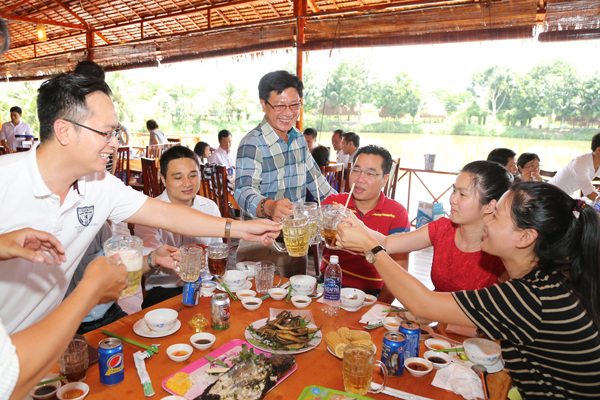 Buổi cơm trưa thật vui với phần góp mặt của các giọng ca tài tử Nam Bộ, anh chị em DNCG cũng tham gia đóng góp các tiết mục giao lưu với Hoàng Quân Group.