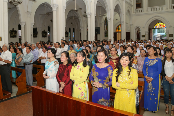 Đến 16h30 chiều, đoàn về đến Nhà thờ Chánh tòa Mỹ Tho, tham dự Thánh lễ mừng kỷ niệm 35 năm Linh mục và 1 năm Đức Cha Phêrô Nguyễn Văn Khảm về Giáo phận Mỹ Tho.