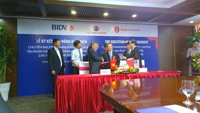 Đại diện BIDV (trái) và VID Public Bank bắt tay trong lễ ký kết chuyển nhượng vốn góp vào tháng 7-2014. Ảnh: Tư Giang