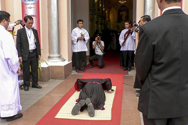 Vừa đến trước cổng nhà thờ, hai Đức Cha Giuse ôm hôn bình an và một bé gái tặng vòng hoa, những tràng pháo tay vui mừng của đoàn con đón Đức Cha tôn kính quí mến. Vào đến trước cửa nhà thờ, Đức Cha phủ phục ( nằm) hôn kính mảnh đất Ngài được Giáo Hội giao phó, cầu nguyện vài giây. Ngài đứng lên, Cha Phao-lô Maria Trần Quốc Việt (Tổng Đại diện, Chánh xứ Chính Tòa ) trao Thánh Giá cho Đức Cha và Ngài đã hôn kính. Sau đó Đức Cha lấy Nước Thánh ghi dấu trên mình và rảy trên cộng đoàn.