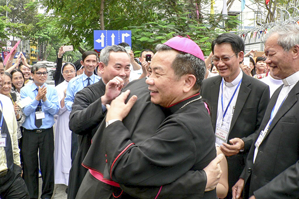 Cha Niên trưởng Ban tư vấn ôm hôn Đức Cha Giuse, Cha bắt tay và ngỏ lời cám ơn Đức TGM Huế: “ Chúng con hết lòng cám ơn ĐTGM, trong tư cách là Tổng Giám mục Tổng Giáo phận nhà, đã giới thiệu Đức Tân Giám mục Giáo phận Đà Nẵng cho chúng con”.