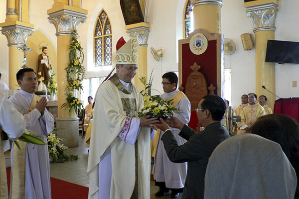 Tiến lên Cung thánh, sau khi làm dấu Thánh Giá và chào bình an, Cha Bona Mai Thái đã giới thiệu với cộng đoàn Danh tính các Đức Cha hiện diện. Cộng đoàn vổ tay vui mừng khi xướng danh các Ngài. Trong thánh lễ còn có sự hiện diện của Đức Phaolô Bùi Văn Đọc – TGM TGP Sài Gòn – Chủ tịch Hội đồng Giám mục Việt nam, Đức TGM Leopoldo Girelli – Đại diện Đức Thánh Cha tại Việt Nam. Đức HY Phê-rô Nguyễn Văn Nhơn- TGM Hà Nội….