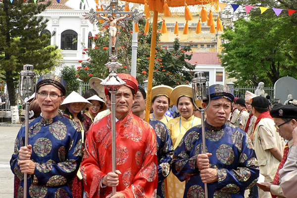 Đúng 10 giờ, đoàn rước từ sân TGM ra nhà thờ Chính Tòa. Đi đầu Thánh Giá đèn hầu, sách Tin Mừng, Đại diện các Hội đồng Mục vụ giáo xứ mặc quốc phục, Thân nhân và đoàn khách Giáo phận Lạng Sơn – Cao Bằng, Quý Tu Sĩ và Quý Cha đồng tế ( quý Cha Gp Lạng Sơn -Cao Bằng, các Giáo phận bạn và trong Giáo phận), và 15 Đức Cha của Hội đồng Giám mục Việt Nam, Đức Cha Giuse-Giám mục Giáo phận và Đức Px Lê Văn Hồng – TGM Tổng Giáo phận Huế đi cuối đoàn rước.
