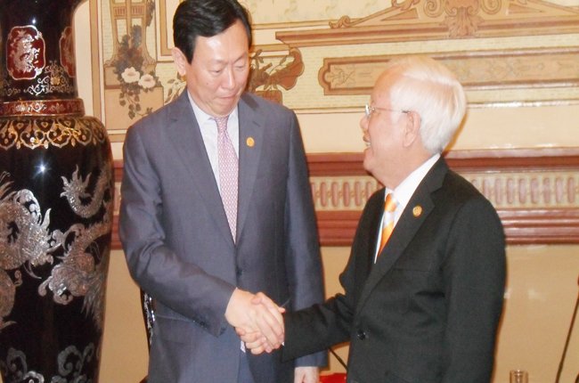 ông Shin Dong Bin, Chủ tịch tập đoàn Lotte, chào Chủ tịch UBND TPHCM Lê Hoàng Quân. (Ảnh SGTO)