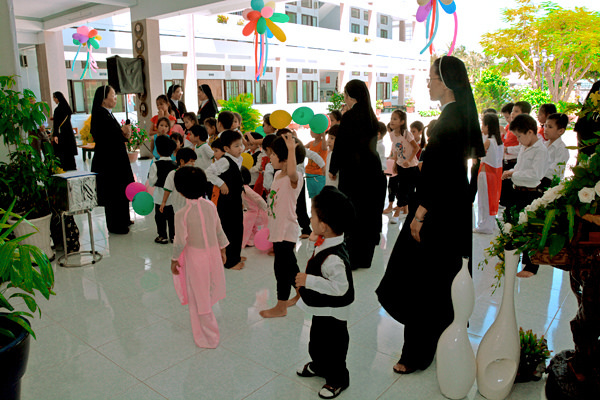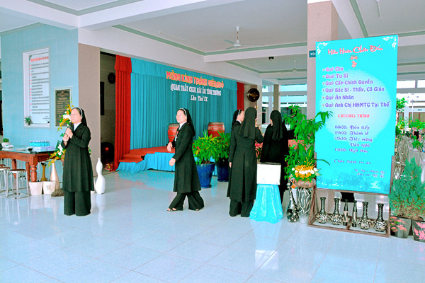 Từ 8giờ, quý nữ tu Mái Ấm đã tề tựu trước tiền sảnh chào mừng quý linh mục, quý tu sĩ nam nữ, quý ân thân nhân gần xa đến chung vui.