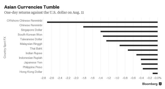 | Mức giảm giá của các đồng tiền châu Á trong ngày hôm qua 11-8 sau khi TQ phá giá đồng NDT 2%. Ảnh Bloomberg |