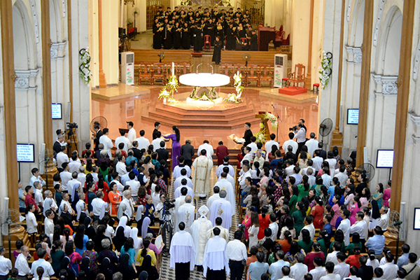Đúng 8g30, trong giai điệu vui tươi của bài ca nhập lễ "Về đây muôn người, về đây chung tiếng hợp hoan cảm tạ hồng ân Thiên Chúa..." các tiến chức cùng đoàn rước tiến lên cung thánh.