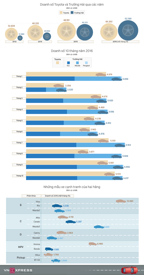 Năm 2015, doanh số xe con của Trường Hải thấp hơn Toyota nhưng suốt 10 tháng 2016, Thaco luôn vượt qua đối thủ.