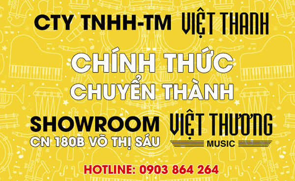 Chính thức từ ngày 6/5/2017, công ty Việt Thanh chính thức sát nhập với thương hiệu Việt Thương Music để trở thành chi nhánh Việt Thương Music - 180 Võ Thị Sáu, kể từ đây công ty Việt Thanh sẽ bước sang trang mới đa dạng hơn về ngành hàng, thương hiệu, tối ưu hơn về vấn đề chăm sóc khách hàng, hỗ trợ khách hàng sau khi bán hàng với các chương trình khuyến mãi, hậu mãi chuyên nghiệp.*