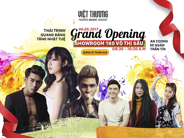 Nhằm đánh dấu sự kiện quan trọng này, Việt Thương Music sẽ tổ chức buổi lễ khai trương, cắt băng khánh thành vào lúc 8:30 AM ngày 6/5/2017 tại địa điểm 180B, Võ Thị Sáu, Phường 7, Quận 3. Buổi lễ khai trương nồng ấm, thân thiện hơn bao giờ hết khi sự góp mặt giao lưu của nghệ sĩ, ca sĩ khách mời như Thái Trinh, Quang Đăng, Mi Ngân, Tăng Nhật Tuệ, Trần Tín, An Coong…